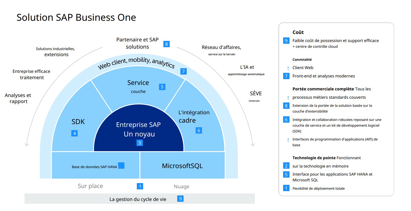 SAP Business One est la référence en matière de solution de gestion intégrée spécialement conçue pour les petites et moyennes entreprises. Reconnue pour sa facilité d'utilisation et sa puissance, elle vous apporte tous les outils nécessaires pour optimiser et centraliser la gestion de vos processus métier au quotidien.